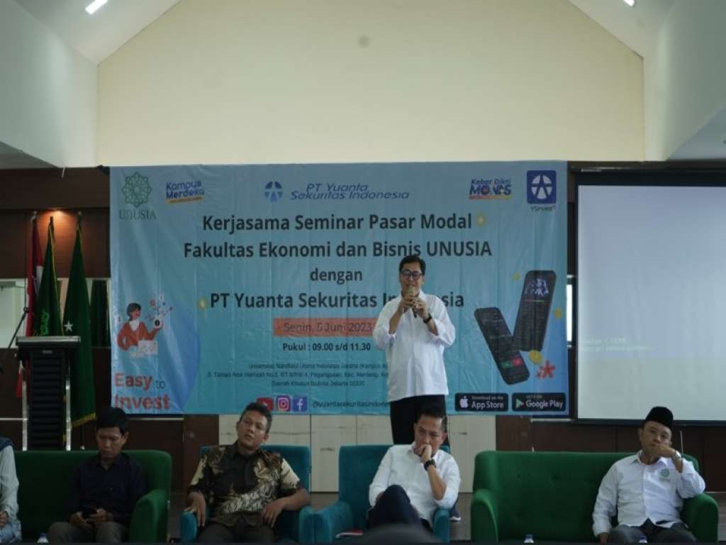 “Mahasiswa FEB Unusia harus memiliki wawasan tentang pasar modal. Kehadiran PT. Yuanta Sekuritas Indonesia ini membantu kita dalam menghadirkan pembelajaran bermakna tentang pasar modal. Karena mahasiswa dapat belajar langsung dari perusahaan yang bergerak di pasar modal,” tegasnya saat memberikan sambutan.