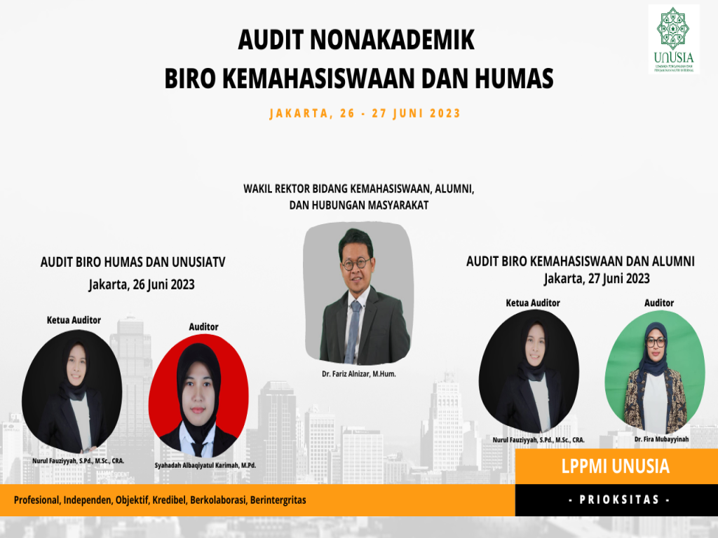Lembaga Pengawasan dan Penjaminan Mutu Internal (LPPMI) Universitas Nahdlatul Ulama Indonesia (UNUSIA) melakukan audit nonakademik pada dua biro, yaitu biro kemahasiswaan, humas, dan lembaga UNUSIA TV. Audit nonakademik ini bertujuan untuk memetakan kondisi fakta dan memastikan kedua biro telah melakukan tugasnya dengan baik.